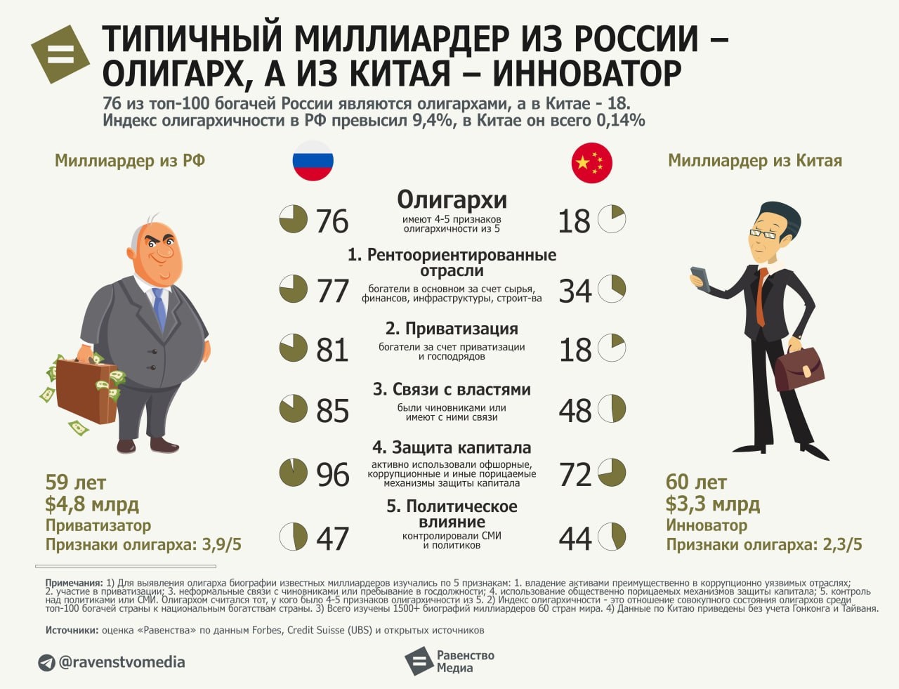 Всего были изучены биографии более 1500 мегабогачей из 60 стран мира по 5 признакам олигархичности. Олигархом считался тот выходец из топ-100 богачей, у кого 4-5 таких признаков из 5.