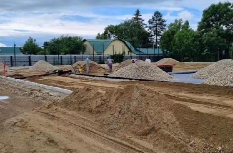 «На настоящий момент выполнены работы по формированию и заливке бетоном баскетбольной, волейбольной площадок. Частично выполнены работы по ограждению забором «3D», производятся работы по отсыпке первого и второго слоев балласта на футбольной площадке, работы по монтажу дренажной системы на футбольном поле, а так же, послойная отсыпка беговой дорожки», — говорится в сообщении.