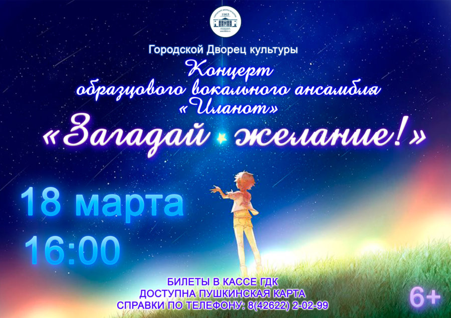 18 марта в зале Городского Дворца культуры состоится концерт «Загадай желание» образцового вокального ансамбля «Иланот» (руководитель Заслуженный работник культуры РФ Ирина Юрьевна Натапова).