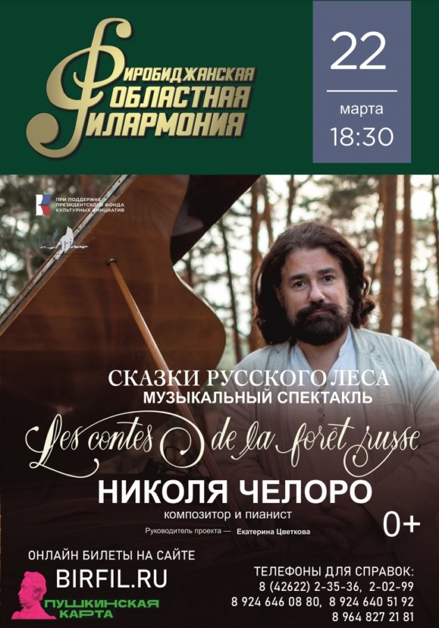 При поддержке Президентского фонда культурных инициатив в городах России, от Владивостока до Калининграда, пройдут музыкальные спектакли, которые представят зрителям в форме театрального действа с мультимедийными декорациями сочинения французского композитора и пианиста Николя Челоро, посвященные темам русского леса, русской деревни и любви к России.