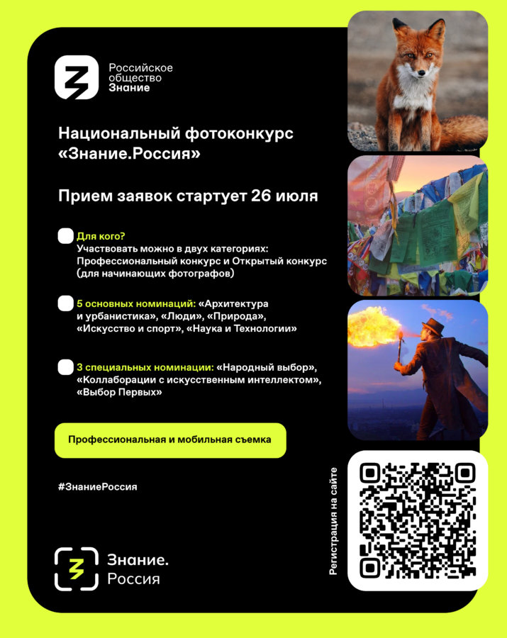 Во всех регионах страны проходит национальный фотоконкурс «Знание.Россия», призванный через фотографии показать достижения нашей страны в XXI веке. На творческое состязание приглашаются профессионалы и любители, которые могут представить фото с мобильных устройств и фотоаппаратов в пяти номинациях.
