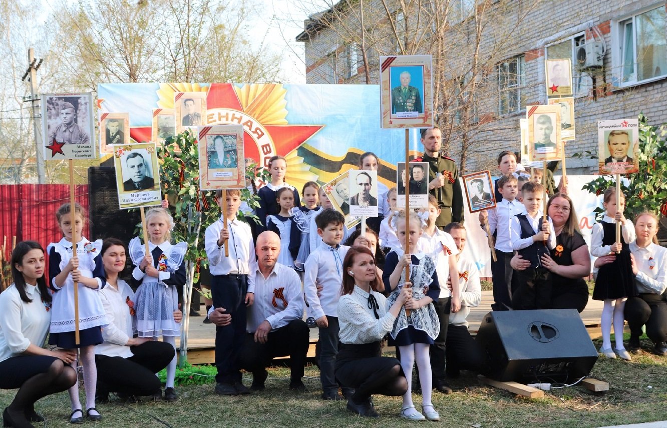 Очень трогательным было выступление детей и родителей. Взрослые прошли с фотографиями родственников — участников войны навстречу детям, тем самым показали, что память о Героях передаётся из поколения в поколение.