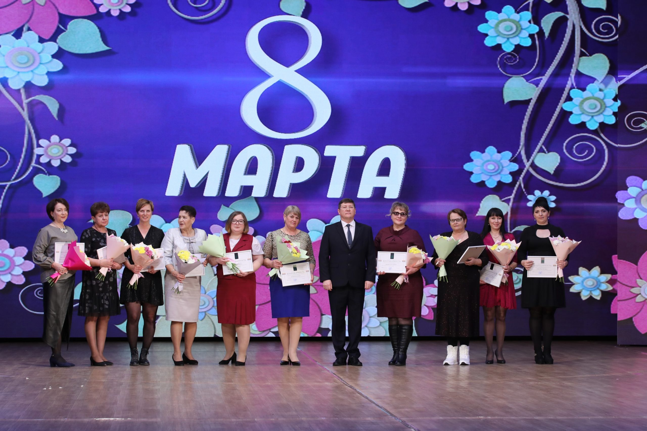 Все женщины, присутствующие в зале, получили в подарок цветы от главы региона.