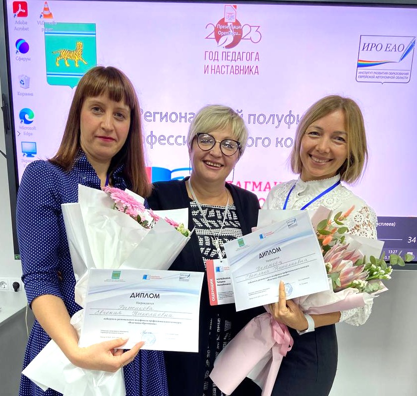 Светлана Николаевна Коломеец, учитель информатики гимназии №1; Евгения Николаевна Рыжикова, учитель английского языка гимназии №1; Виктория Александровна Паздникова, учитель начальных классов лицея №23. Победители регионального этапа будут представлять ЕАО в финале конкурса, который состоится уже в ноябре.