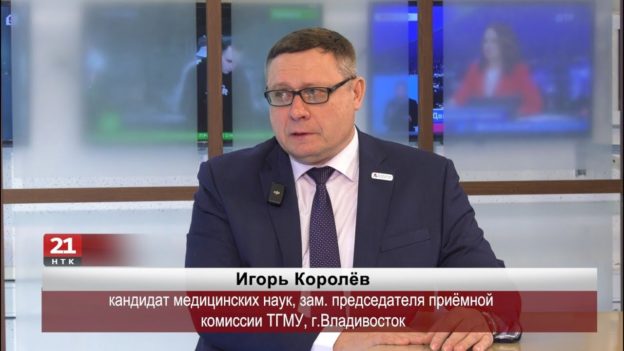 Заместитель председателя приёмной комиссии Тихоокеанского государственного медицинского университета, кандидат медицинских наук Игорь Королев стал гостем в студии телеканала НТК21. Игорь Борисович пригласил абитуриентов из ЕАО поступать в вуз Владивостока и отметил, что студенты ТГМУ проходят практику с применением самых современных тренажёров, а выпускники вуза получают работу ещё задолго до окончания университета.