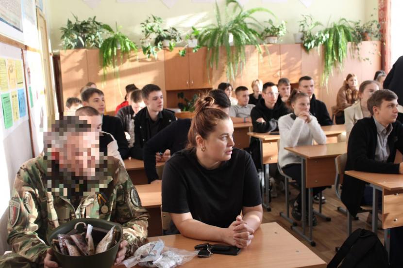 Недавно боец приехал в родной посёлок в краткосрочный отпуск из зоны боевых действий и зашел в родную школу, чтобы пообщаться с учащимися.