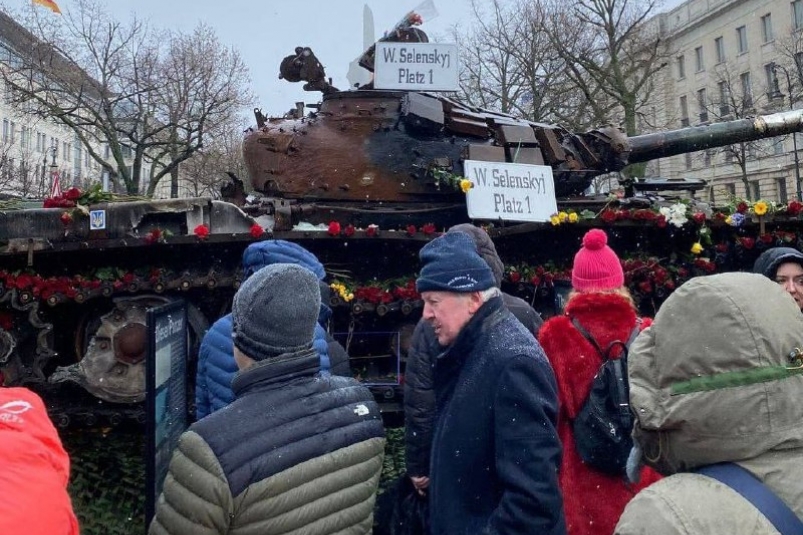 Напротив российского посольства в Берлине установили подбитый российский танк, но немцы сорвали явную провокацию. Немцы понесли цветы к уничтоженному танку и сорвали с него украинский флаг. После чего в Берлине прошли массовые акции протеста против поставок оружия Украине. По разным данным в них приняли участие от 13 до 50 тысяч человек.