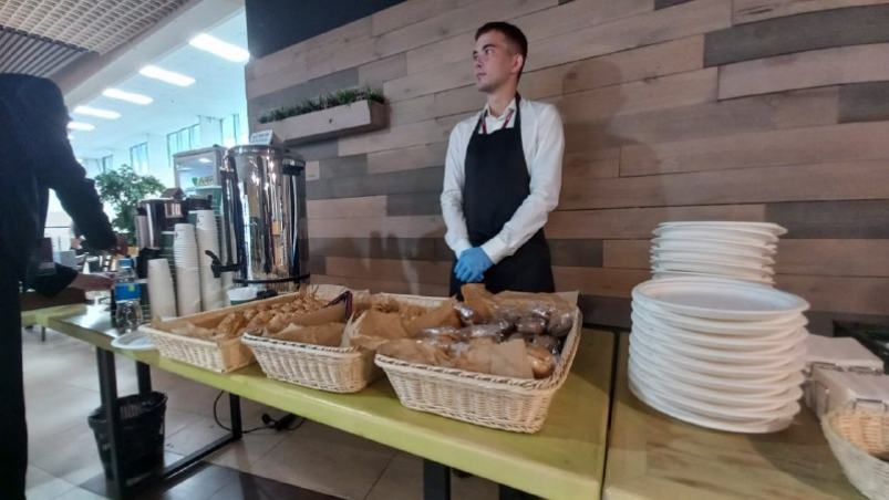 Согласно официальной информации, холодные и горячие напитки доступны на уровне В7. А легкие закуски — в кафе "Маяк" (В5) и на уровне А8. Среди предлагаемых на ВЭФ закусок — сэндвичи с различными начинками, слойки и круассаны. Как пояснили сотрудники точки питания, вся выпечка свежая, выпекают ее на нижнем уровне и тут же приносят на кофе-брейк. Но есть и сэндвичи в заводской упаковке. Как и легкие фруктовые десерты они произведены одним из лидеров рынка кондитерских и хлебобулочных изделий Санкт-Петербурга. Продукция была заморожена для транспортировки, а здесь прошла дефрострацию. Из напитков предлагаются чай, кофе и вода.