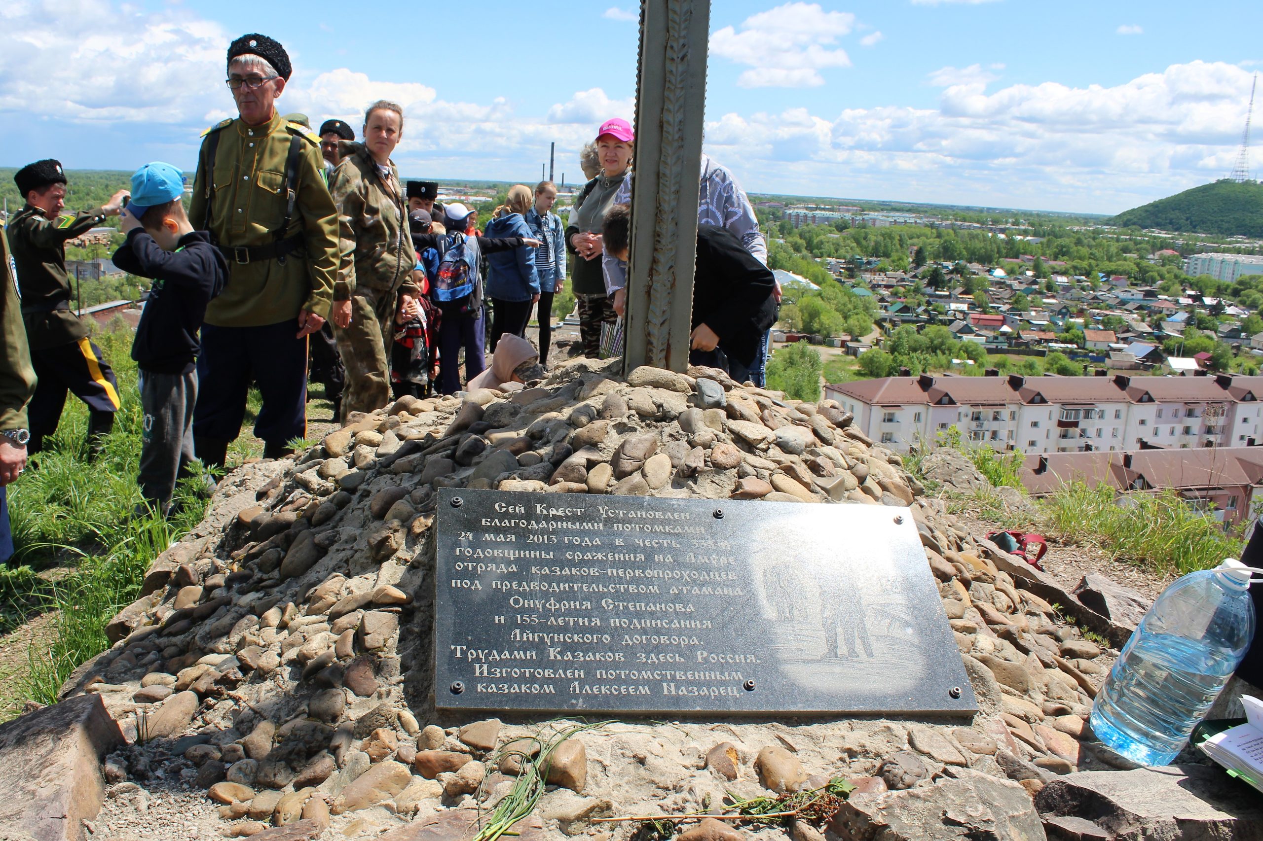 Сегодня, по благословению Архиепископа Биробиджанского и Кульдурского Ефрема, казаки Средне Амурского окружного казачьего общества (САОКО) с духовником, настоятелем свято-Никольского казачьего храма протоиереем Георгием Борисовым, во главе с атаманом Николаем Шкарупо, казачатами и неравнодушными горожанами совершили у подножия креста благодарственный молебен и литию в память казаков — первопроходцев, много сил приложивших, «чтобы здесь была Россия ».